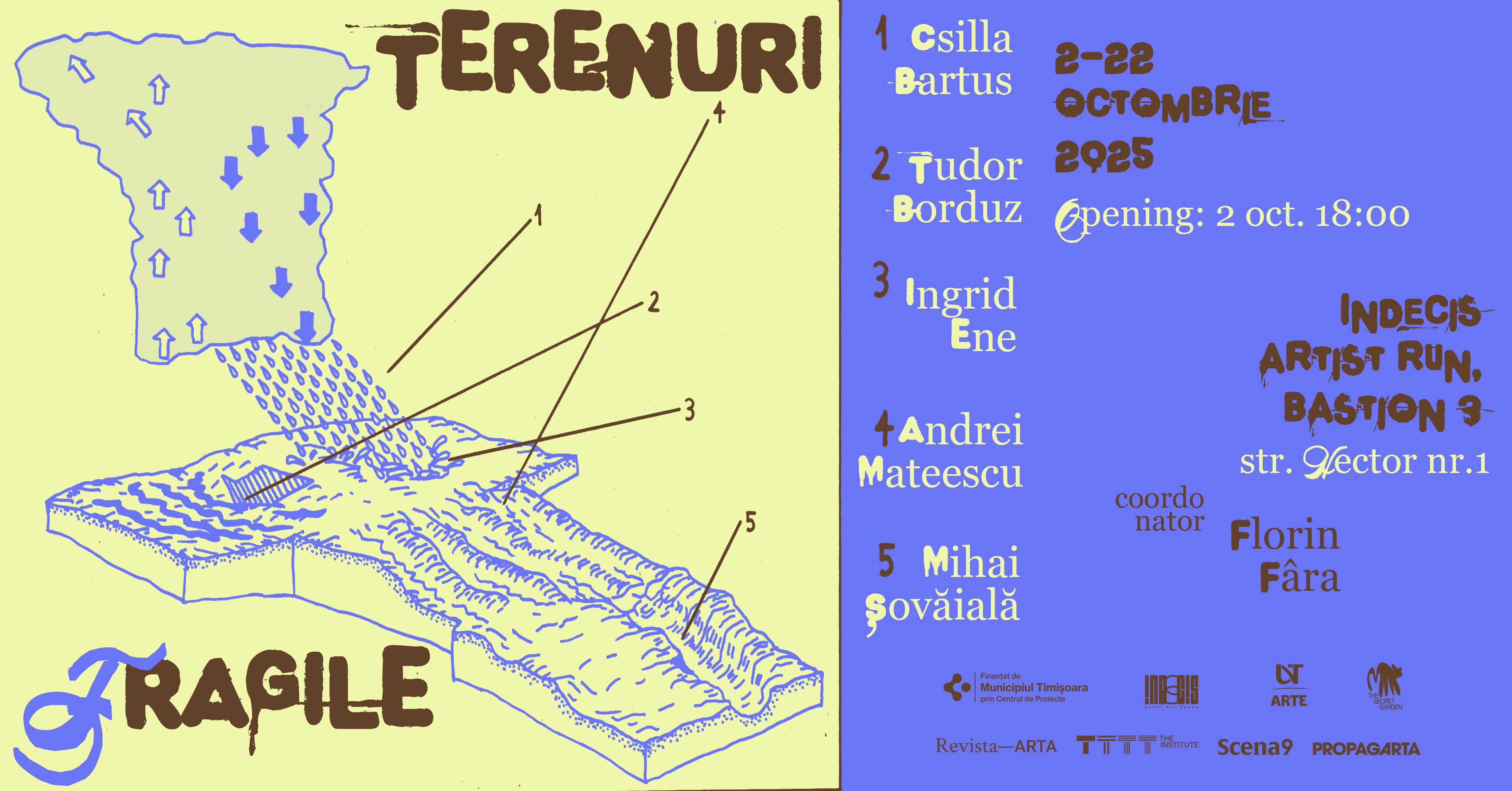 Terenuri fragile se deschide joi, 2 octombrie 2025, de la 18:00, la Indecis artist-run space, Bastion 3, str. Hector, nr.1, Timișoara, și poate fi vizitată până în 22 octombrie. Program de vizitare: miercuri–vineri: 16:00–19:00 / sâmbătă: 11:00–16:00.