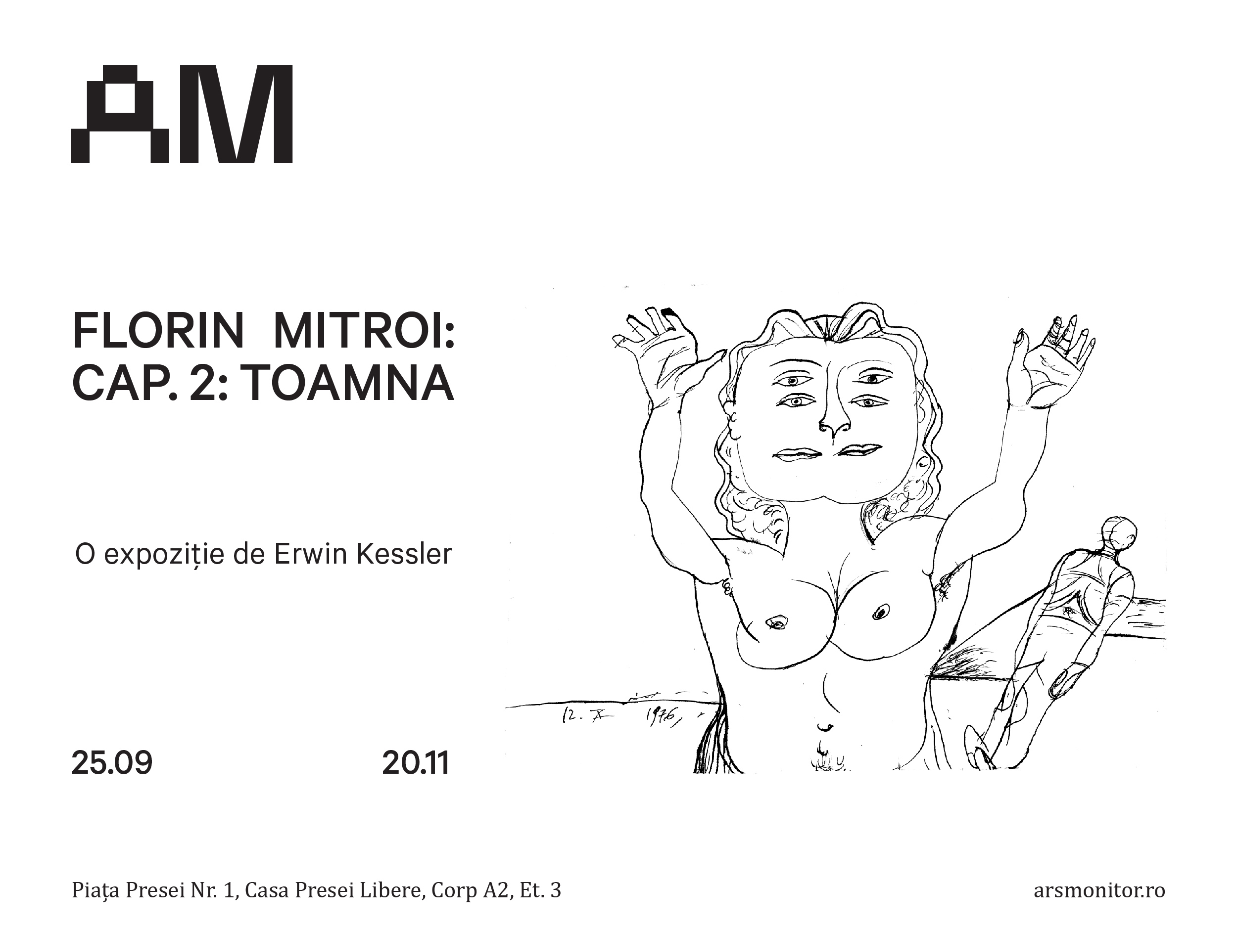 Galeria Arsmonitor are plăcerea să anunțe continuarea colaborării cu Erwin Kessler, unul dintre cei mai influenți curatori și istorici de artă actuali, care s-a dedicat cercetării și îngrijirii operei artistului Florin Mitroi, profesorul mentor al unei întregi generații de artiști, precum Suzana Dan, Dumitru Gorzo, Alexandru Rădvan, Anca Benera, și mulți alții. Acest al doilea capitol expozițional dedicat artistului Florin Mitroi, „Cap. II: Toamna”, aduce în fața publicului, în premieră absolută, o selecție de desene recent scoase la lumină, care nu au mai fost expuse până la această dată și care acoperă o parte din opera artistului din perioada 1960 -’70. Expoziția va fi include și lucrări selectate din opera artistului prea puțin cunoscute. În prezent, o parte relevantă din opera lui Florin Mitroi face parte din colecția muzeului Lenbachhaus, Munchen.