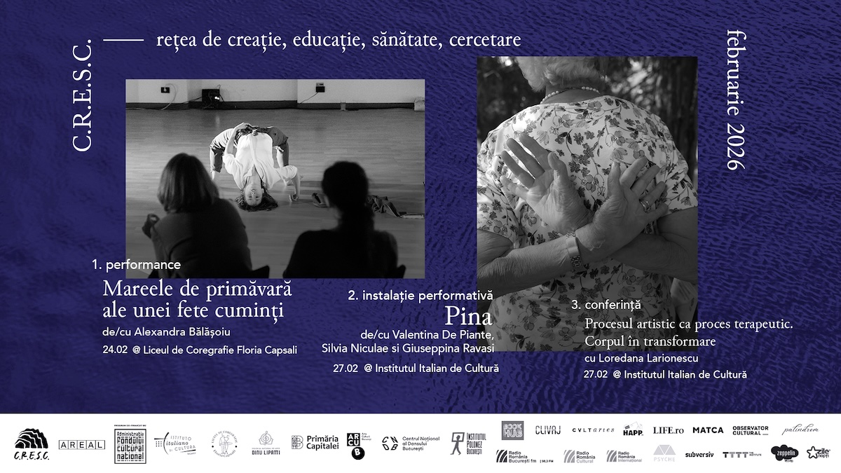 În luna februarie 2026, proiectul multianual C.R.E.S.C. propune evenimente-cheie care explorează corpul ca spațiu de cunoaștere, memorie și transformare, situate la intersecția dintre artă, educație și sănătate mintală. Programul cuprinde un format dedicat elevilor Liceulului de Coregrafie ”Floria Capsali ”, studenților Universității Naționale de Artă Teatrală și Cinematografică "I.L. Caragiale"- Coregrafie și publicului interesat cu două performance-uri, o conferință, și patru ateliere. Performance-ul „Mareele de primăvară ale unei fete cuminți” de Alexandra Bălășoiu, va avea loc pe 24 februarie la Liceul de coregrafie „Floria Capsali” (Str. Căpitan Gheorghe Preoțescu nr. 9, București ), funcționează ca o punte între experiența artistică și reflecția colectivă asupra nebuniei, memoriei și stigmatizării sociale. Pe 27 februarie, la Institutul Italian de Cultură din București (Aleea Alexandru nr. 41), instalația performativă „Pina”, semnată de Valentina De Piante, Silvia Niculae și Giuseppina Ravasi, propune o meditație intergenerațională asupra hiper-vizibilității, comunicării și memoriei. Cele două performance-uri vor fi urmate de conferința „Procesul artistic ca proces terapeutic. Corpul în transformare”, susținută de dans-terapeuta Loredana Larionescu. În același cadru, debutează cu atelierele de diseminare de metode somatice, susținute de coregrafele Cristina Lilienfeld și Alexandra Bălășoiu, două dedicate elevilor de la Liceul de coregrafie „Floria Capsali” și două studenților Universității Naționale de Artă Teatrală și Cinematografică "I.L. Caragiale"- Coregrafie. Aceste întâlniri propun o introducere experiențială în practici educaționale somatice inspirate din metoda Body Mind Centering, o metodă de cercetare foarte complexă creata de Bonnie Bainbridge Cohen ce conectează mișcarea, percepția și anatomia trăită, și creează contexte sigure de explorare a autenticității corporale și a relației corp–minte, în spații educaționale și artistice. Întregul programul deschide dialoguri sensibile despre boala psihică, îmbătrânire și imaginea de sine. Împreună, aceste inițiative configurează un spațiu de întâlnire între practici artistice, somatice și terapeutice, reafirmând miza C.R.E.S.C. de a integra arta în procesele de îngrijire și educație. Accesul publicului la cele două evenimente este liber, pe bază de înscriere.